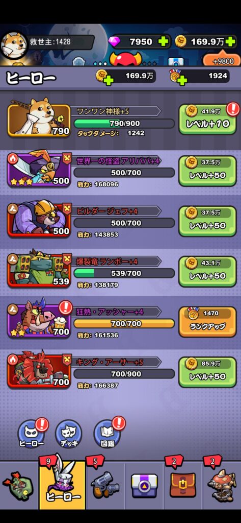 集めた素材を使って、ヒーローの攻撃力や防御力、HPを少しずつ強化していく流れです。