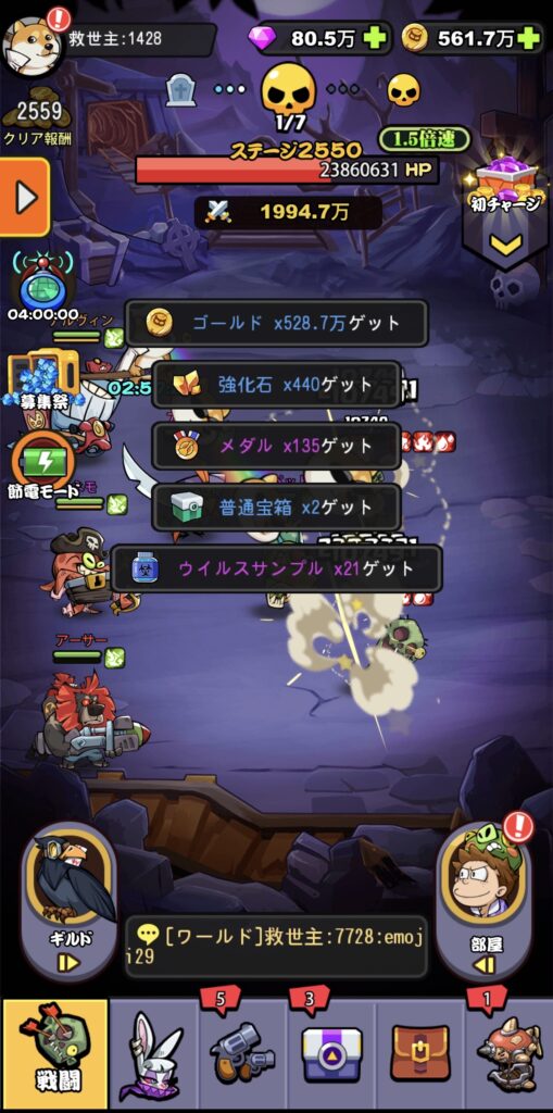 ステージクリアやデイリーミッションをこなしていくと、ゴールドやダイヤ、強化石など、いろいろな報酬がもらえます。